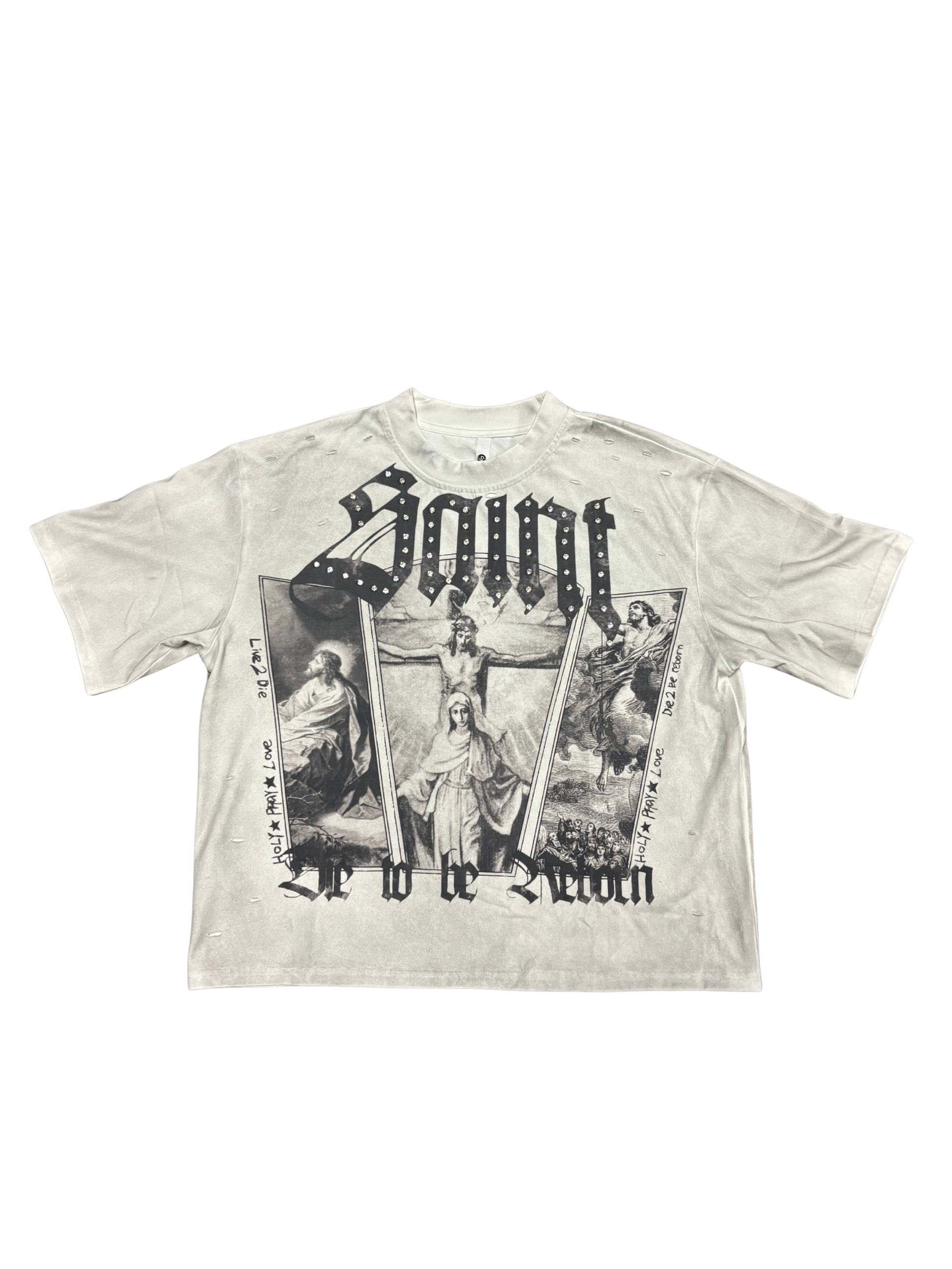 Stand out with the Saint Rhinestone Vintage Distressed Tee in white. This statement piece features the same gothic-inspired crucifix artwork, but elevated with hand-placed rhinestones across the “Saint” logo for a touch of shine. Like its counterpart, it’s finished with a dirty wash and distressing to capture the essence of true vintage wear.