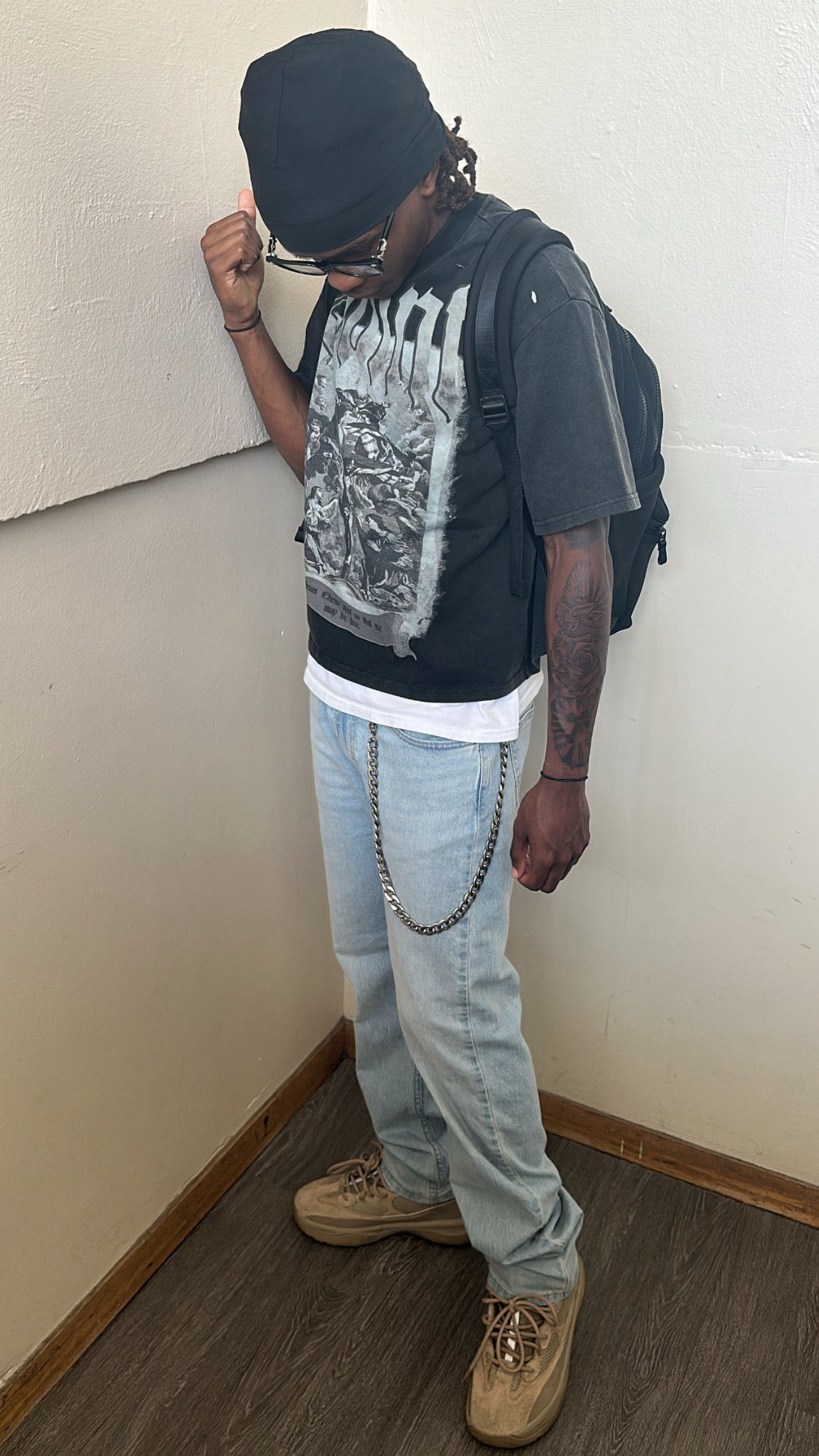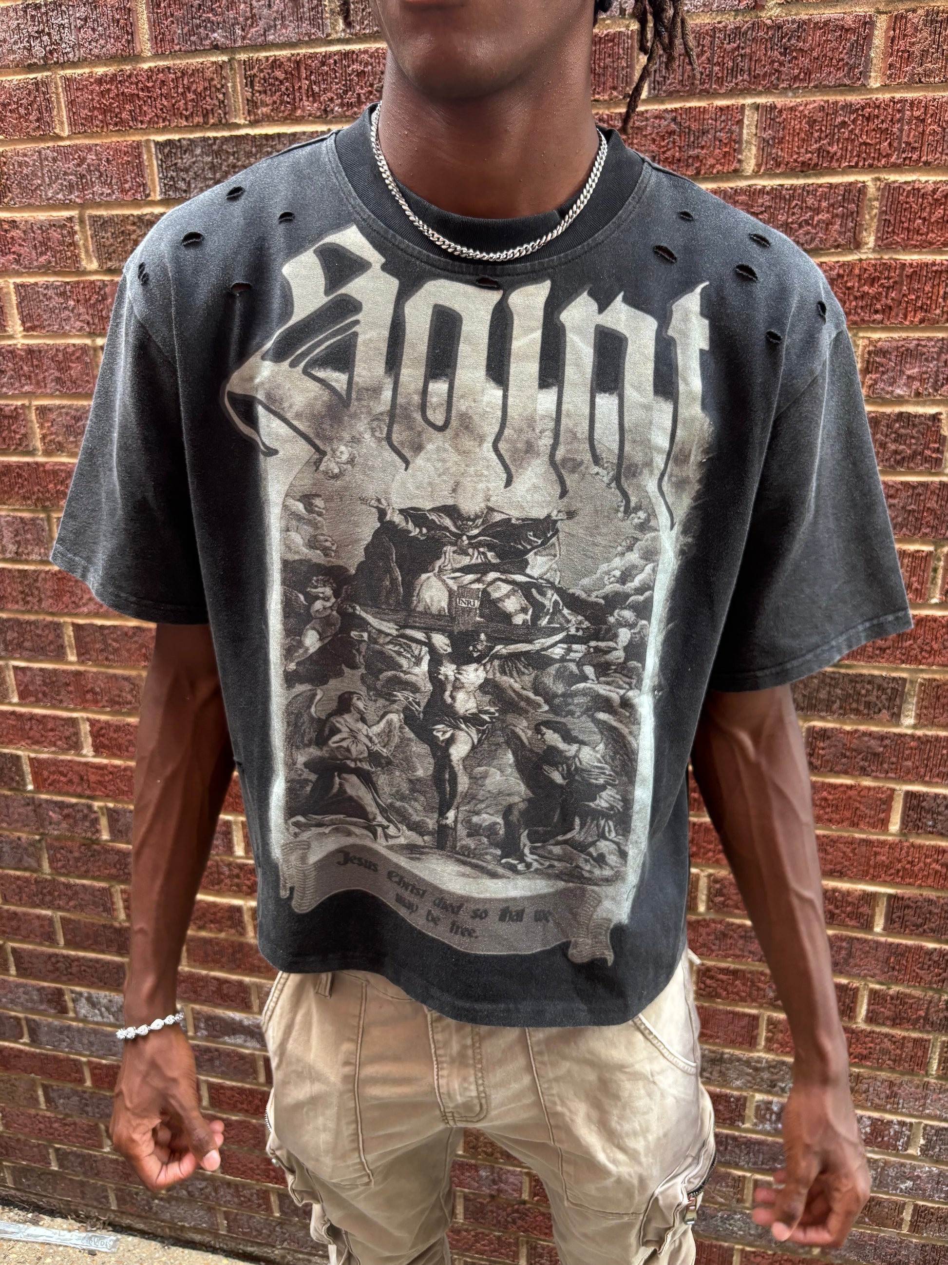 Elevate your streetwear game with the Saint Vintage Distressed Tee in black. Featuring a bold gothic “Saint” graphic and an intricate crucifix artwork, this tee blends religious iconography with a raw, edgy aesthetic. Each piece is dirty-washed for a lived-in look and detailed with intentional distressing, giving it that perfectly worn vintage vibe.